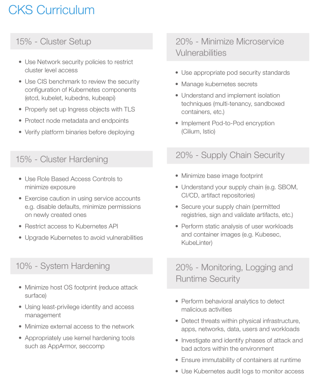 ๐ CKS# ๐งพ Certified Kubernetes Security Specialist# linuxfoundation cks lfx.linuxfoundation.org killer.sh killercoda.com - login guisam credly badges ๐ View online resources# home page releases documentation source code opened bug issues ๐ชช Curriculum# See cncf/curriculum . Or CKS_Curriculum_v1.34.pdf. ๐๏ธ Topics# ๐ Cluster Setup ๐ Cluster Hardenning ๐ System Hardenning ๐ Minimize Microservice Vulnerabilities ๐ Supply Chain Security ๐ Monitoring, Logging and Runtime Security