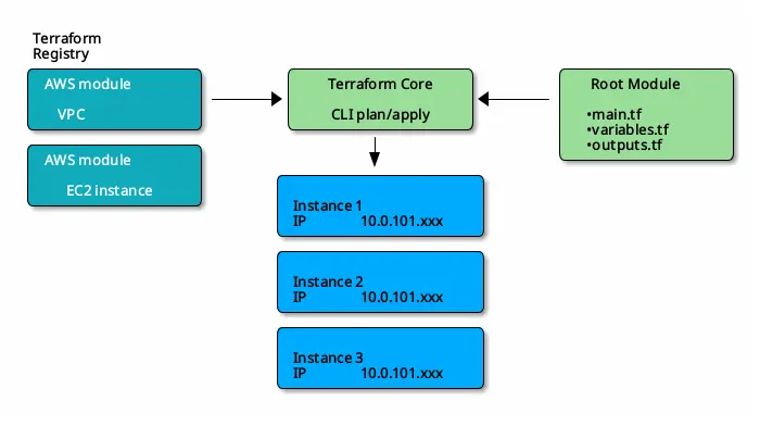 module:Reuses pre-defined configurations (modules) from local directories or the Terraform Registry to promote code reuse and modularity.module "vpc" { source = "terraform-aws-modules/vpc/aws" version = "3.0.0" cidr_block = "10.0.0.0/16" }